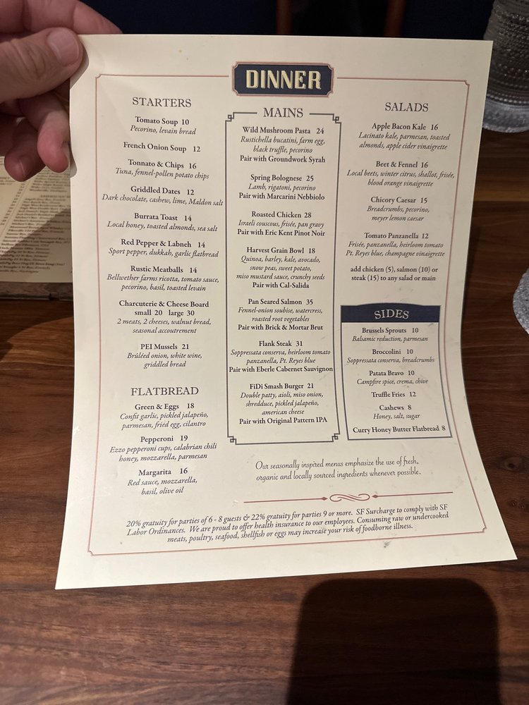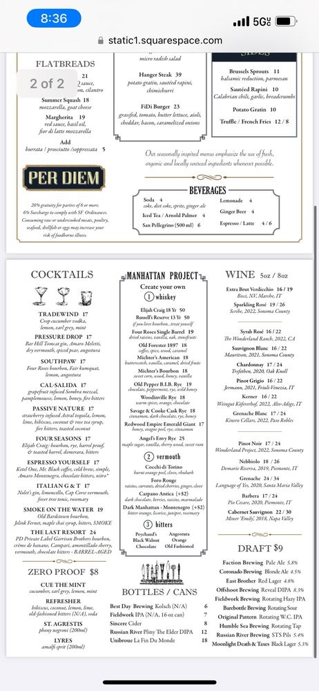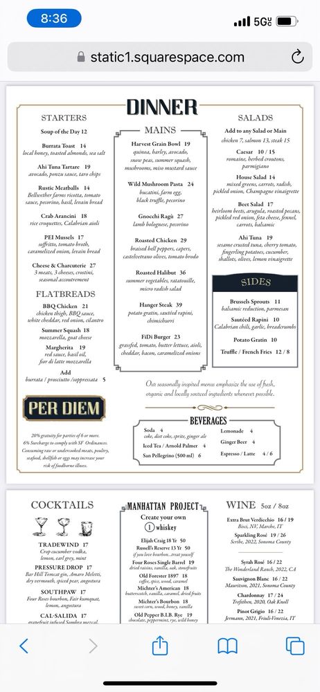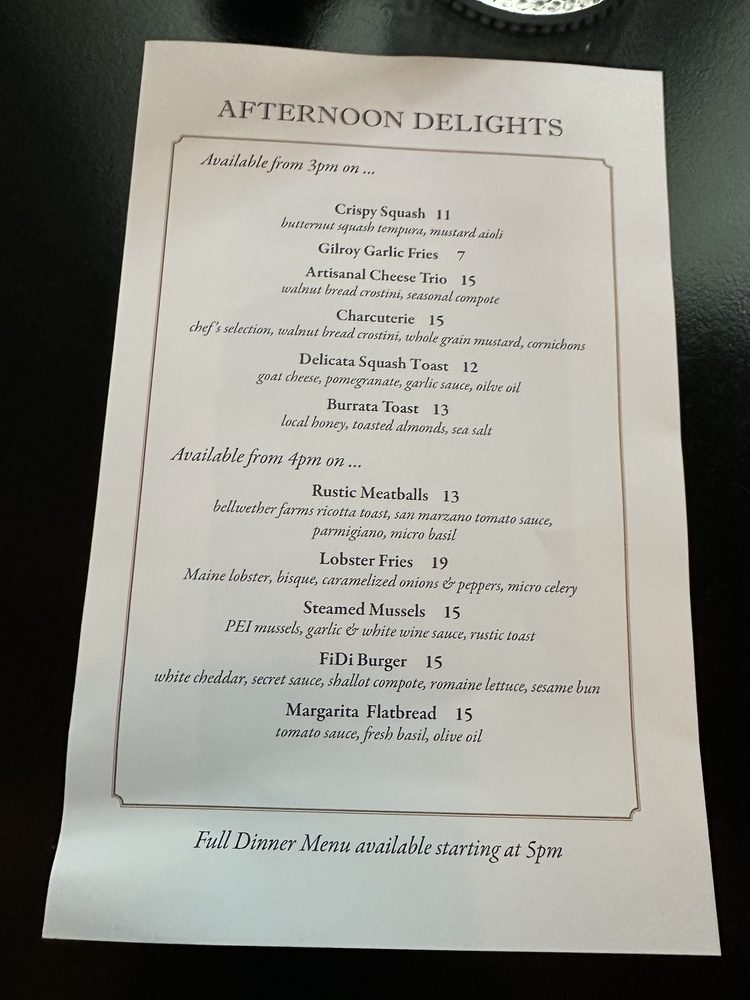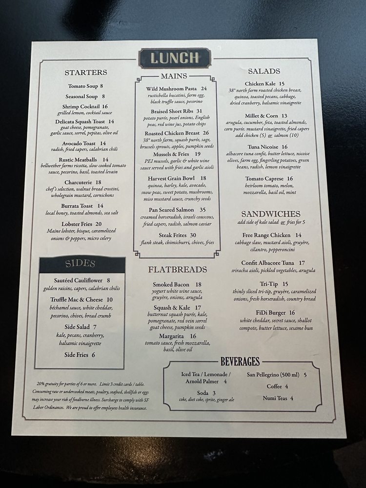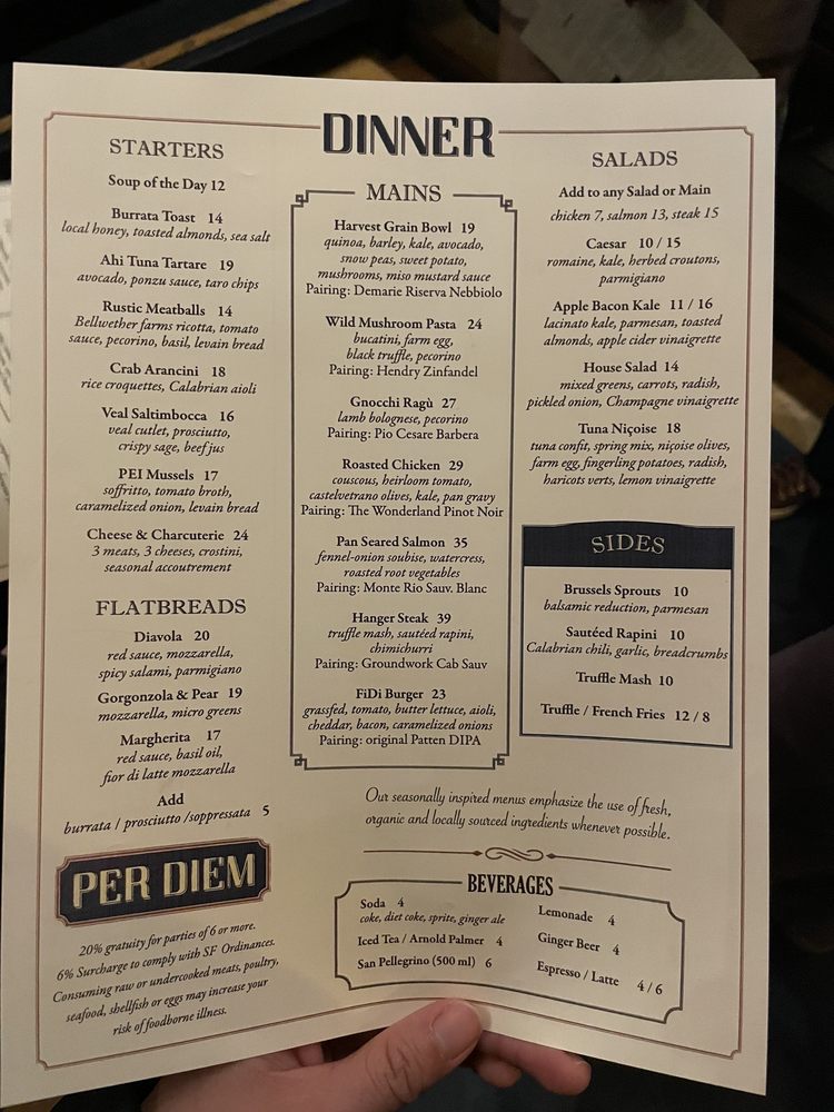 Per Diem - Financial District in San Francisco offers a trendy dining experience with a variety of options for vegetarians and even vegan choices. The menu includes delicious starters like Burrata Toast and Tuna Tartare, followed by refreshing salads and satisfying mains like Wild Mushroom Pasta and Roasted Chicken. The ambiance is perfect for business lunches or special dinners, with professional and efficient service to make your experience memorable. Customers have raved about the attentive staff, flavorful dishes, and the overall dining experience. Don't miss out on favorites like the Crab Arancini and Gnocchi Ragu. Whether you're dining with colleagues, catching up with friends, or looking for a fancy dinner spot, Per Diem - Financial District is a must-visit in the heart of the city.